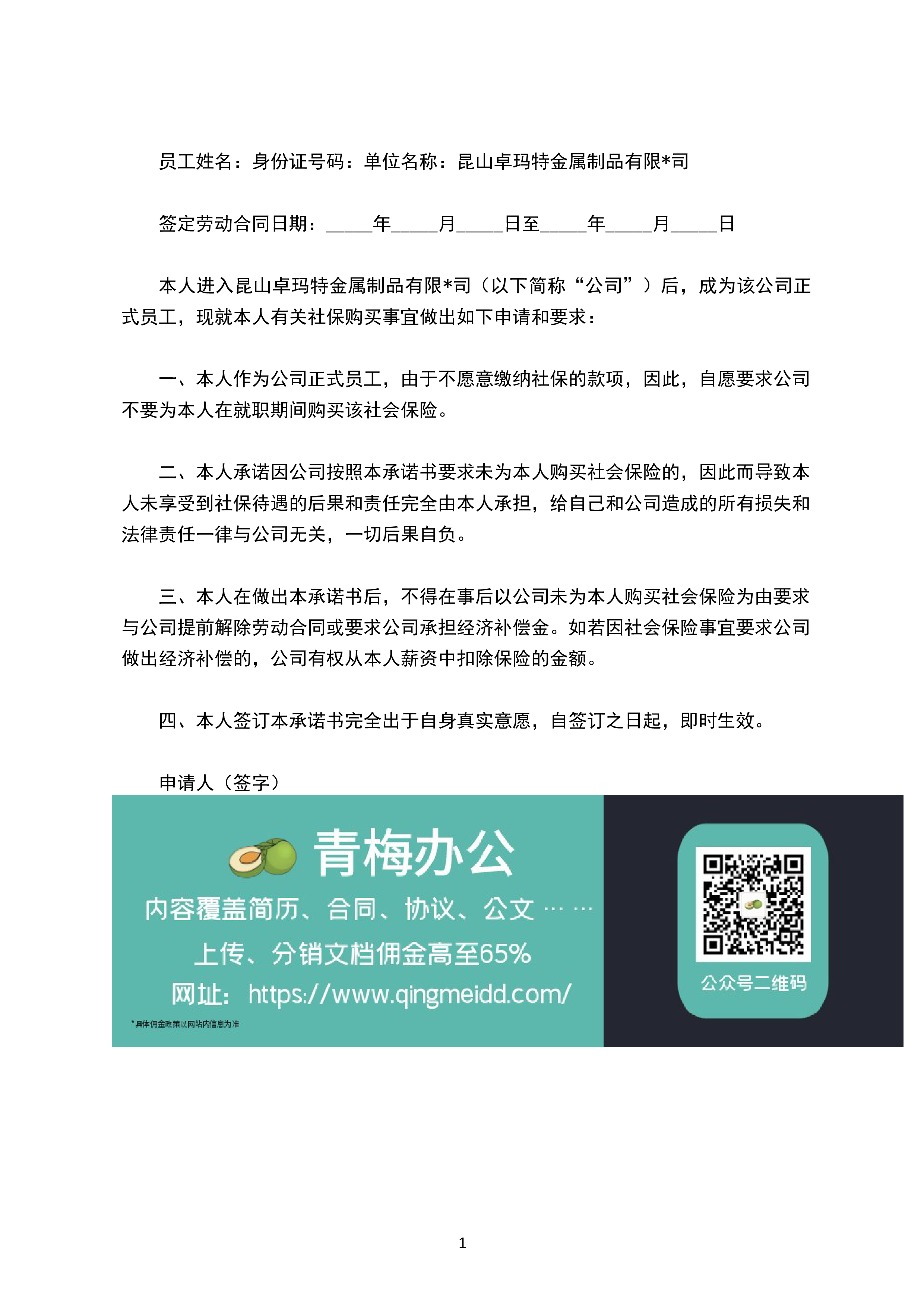 员工姓名:身份证号码:单位名称:昆山卓玛特金属制品有限*司签定劳动合同日期:_____年_____月_____日至_____年_____月_____日本人进入昆山卓玛特金属制品有限*司(以下简称“公司”)后,成为该公司正式员工,现就本人有关社保购买事宜做出如下申请和要求:一、本人作为公司正式员工,由于不愿意缴纳社保的款项,因此,自愿要求公司不要为本人在就职期间购买该社会保险。二、本人承诺因公司按照本承诺书要求未为本人购买社会保险的,因此而导致本人未享受到社保待遇的后果和责任完全由本人承担,给自己和公司造成的所有损失和法律责任一律与公司无关,一切后果自负。三、本人在做出本承诺书后,不得在事后以公...