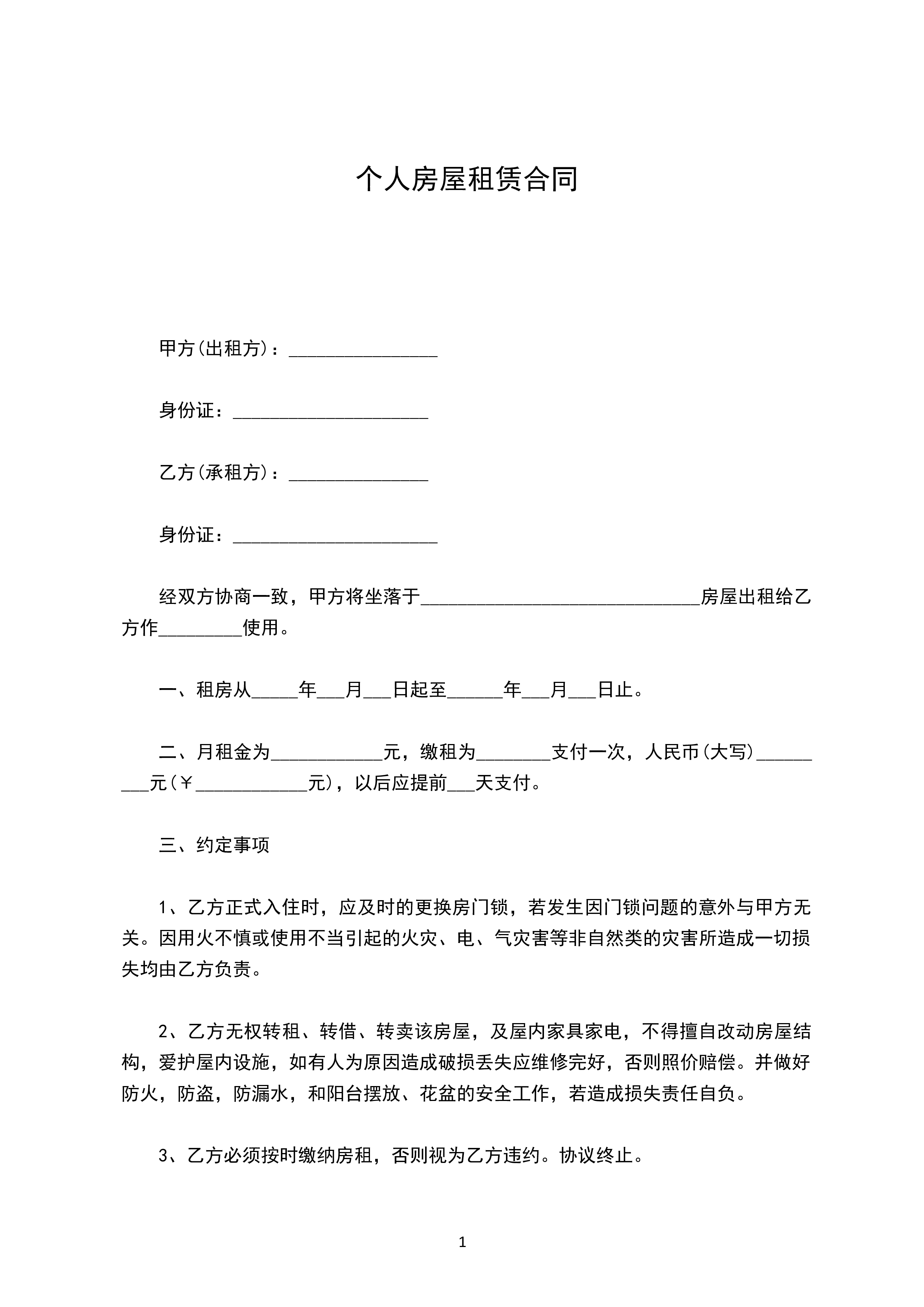 个人房屋租赁合同甲方(出租方):________________身份证:_____________________乙方(承租方):_______________身份证:______________________经双方协商一致,甲方将坐落于______________________________房屋出租给乙方作_________使用。一、租房从_____年___月___日起至______年___月___日止。二、月租金为____________元,缴租为________支付一次,人民币(大写)_________元(¥____________元),以后应提前___天支付。三、约定事项1、乙方...