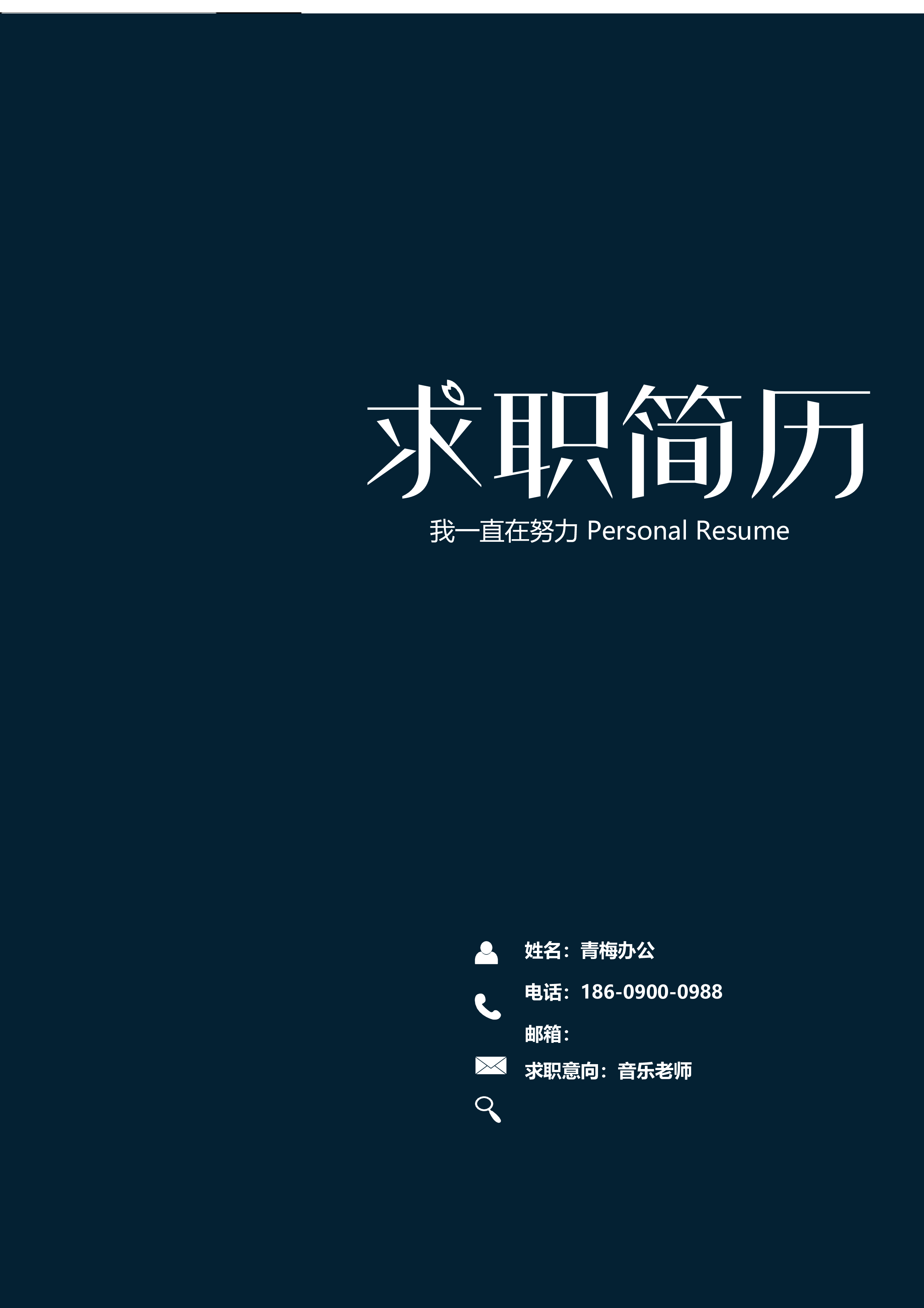 我一直在努力PersonalResume姓名:青梅办公电话:186-0900-0988邮箱:求职意向:音乐老师、自荐信尊敬的领导: 您好! 首先感谢您在百忙之中浏览我的求职信。 我是xx大学xx专业的毕业生。经过大学四年的锻炼,我的整体素质有了较大的提高。在大学里,我努力学习专业知识,刻苦钻研,在班上成绩一直排名第一,并连续两年被评为优秀学生。在校期间,我担任过班上的学习委员,学院学生会劳卫部干事,具有一定的工作能力和组织协调能力。此外我还具有较强的责任心,能吃苦耐劳、诚实、自信、敬业;具备持之以恒的毅力,并能脚踏实地的办好每一件事情。 善于学习,独立思考,踏实严谨,勇担责任,是大学学...