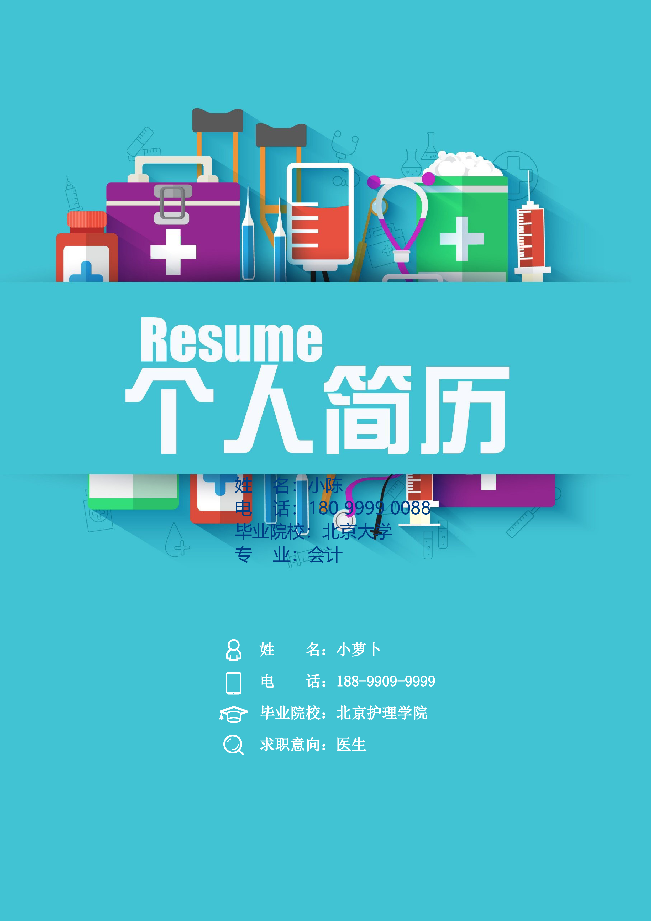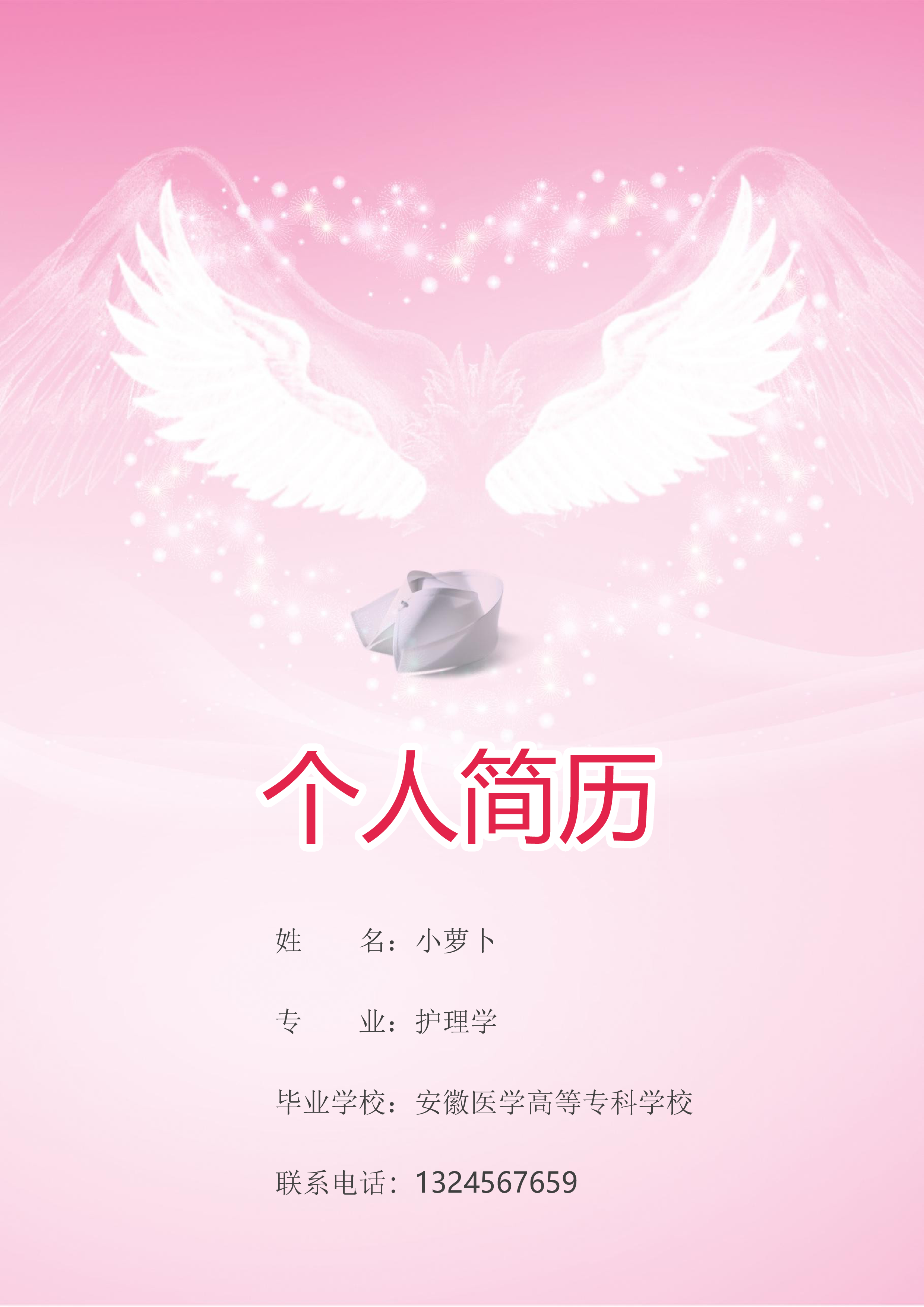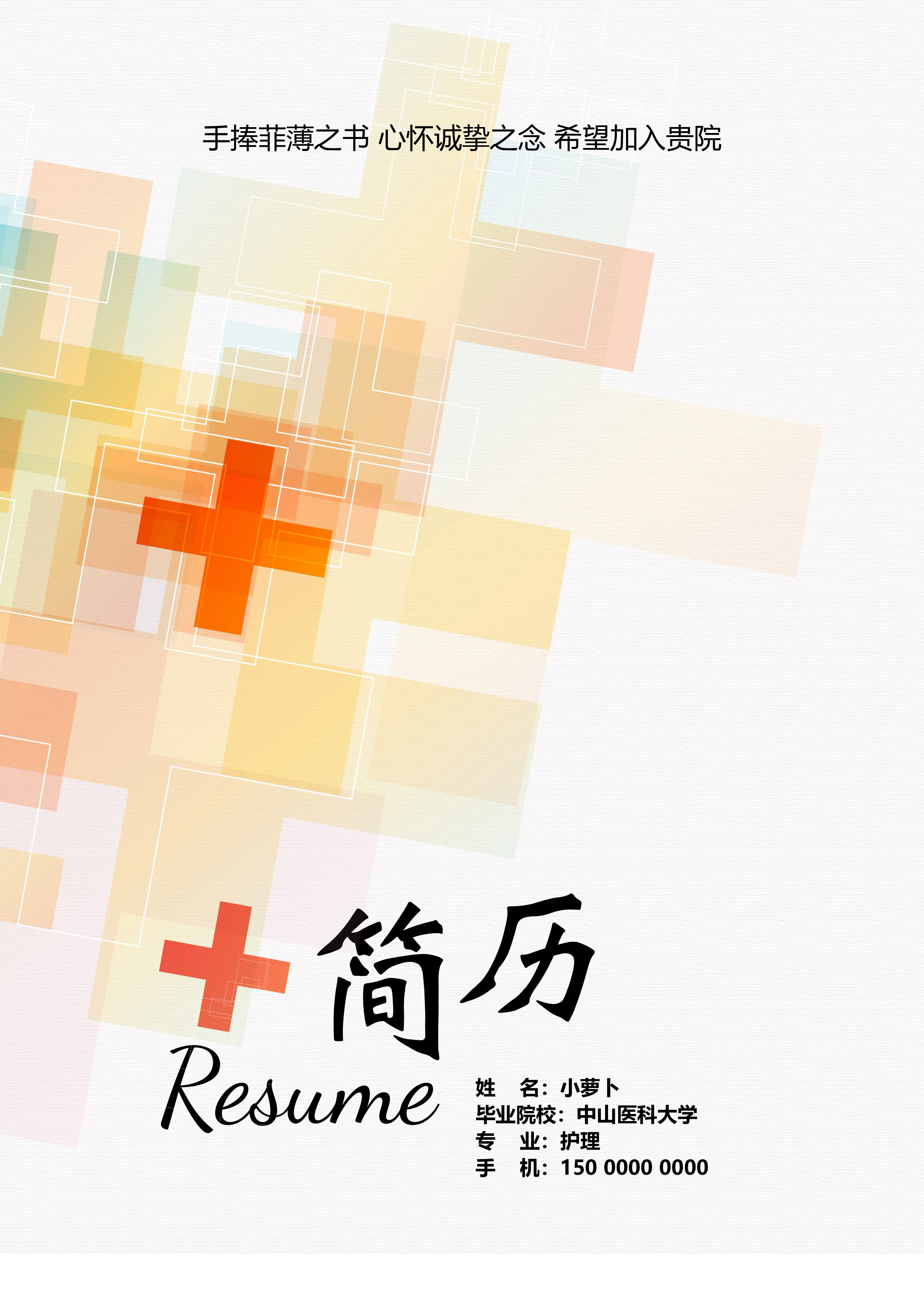 姓名:小萝卜毕业院校:中山医科大学专业:护理手机:15000000000手捧菲薄之书心怀诚挚之念希望加入贵院2012.09-2016.07北京护理学院护理学本科主修:主修课程:护理学导论、护理美学、基础护理学、内科护理学、外科护理学、妇产科护理学、儿科护理学、老年病护理学、急救护理、护理心理学、护理教育、护理管理实习时间2020年5月-2020年10月:地点:北京市第一人名医院。职务:病房护理科护士工作内容:负责药品检查、打针、配药、病人护理、病人看护、急重病人看护、心里咨询、配合护士长完成日常工作等。实习时间2020年5月-2020年10月:地点:北京西城区人民医院。职务:护士组长工作内容:...