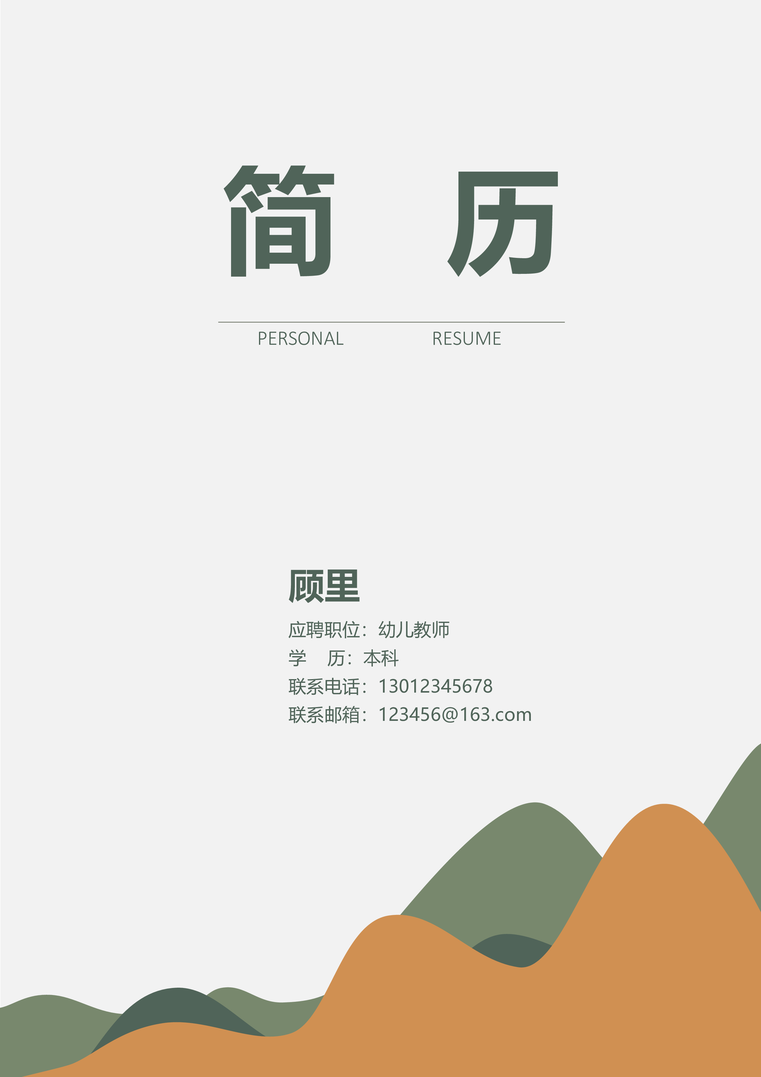 简历PERSONALRESUME顾里应聘职位:幼儿教师学历:本科联系电话:13012345678联系邮箱:123456@163.com校园经历技能证书自我评价教育背景兴趣爱好个人信息时间:20xx.09-20xx.07学校:广州大学专业:学前教育/本科主修课程:幼儿教育学,幼儿卫生学、幼儿心理学、学前教育学、绘画、美工、幼儿舞蹈创编,幼儿园组织与管理,幼儿园教育科研方法等。在校期门荣获国家励志奖学金、学年校级“三好学生”称号、学年校级“优秀干部”称号、校学生会”优秀干事”等荣誉称号。顾里求职意向:幼儿教师时间:20xx.09-20xx.07单位:校学生会文艺部职位:社员1、为各类文艺晚会、联谊...