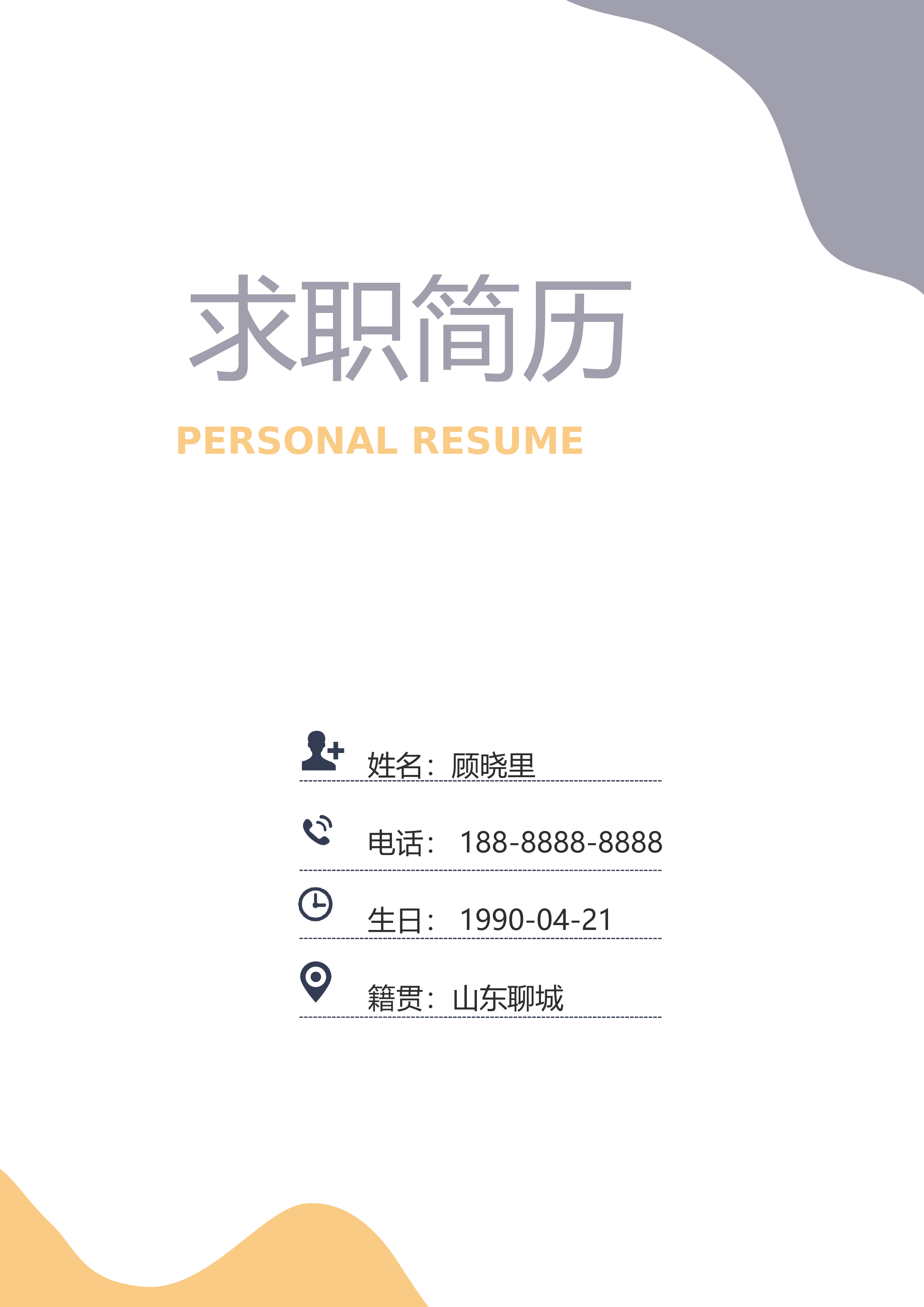 PERSONALRESUME求职简历姓名:顾晓里电话:188-8888-8888生日:1990-04-21籍贯:山东聊城自荐信尊敬的各位领导:您好!感激您在百忙中抽空翻阅我的自荐材料,以下是我的求职自我介绍。我是XX大学XX学院XX专业XX届毕业生。本人久慕贵公司盛名,深知贵公司实力雄厚、工做氛围活跃、工做态度严谨、极具活力。若能用我所学的学问,为贵公司效力将是我无尚的光荣。希望我的毛遂自荐,能为贵公司奉献我的绵薄之力。会计是对会计单位的经济业务从数和量两个方面进行计量、记录、计算、分析、检查、预测、参与决策、实行监督,旨在提高经济效益的一种核算手段,它本身也是经济管理活动的重要组成部分。会计...